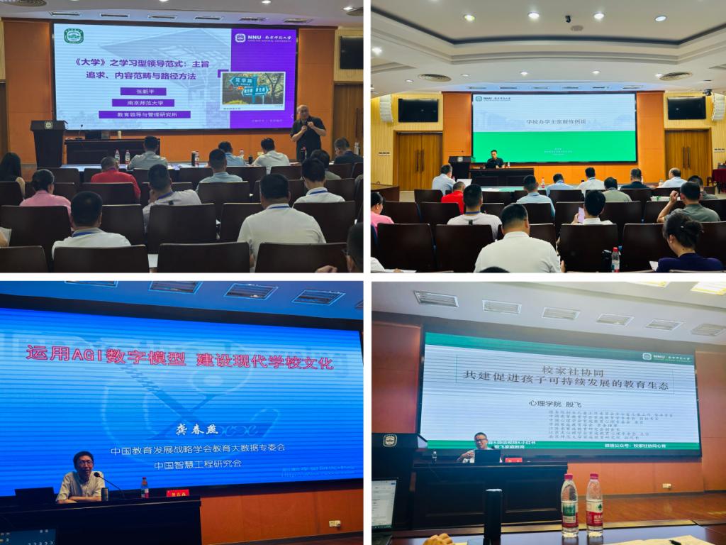 南师大强大的专家团队倾囊相授,张新平教授从儒家经典《大学》中提炼“学习型领导范式”,为校长提升领导力、推动终身学习提供了传统智慧的当代启示。陈学军教授围绕“做什么样的教育,办什么样的学校,培养什么样的人”根本命题,深入剖析办学主张凝练的实践路径。殷飞教授聚焦“校家社协同育人”,从心理学视角解析如何构建促进孩子可持续发展的教育新生态。龚春燕教授带来《运用AGI数字模型建设现代学校文化》前沿讲座,展示了人工智能赋能学校文化重塑与品牌创建的广阔前景。沈书生教授深入解读《数字赋能学校管理者领导力变革》,剖析在数智化浪潮下学校管理者领导力的内涵转型与实践方法。