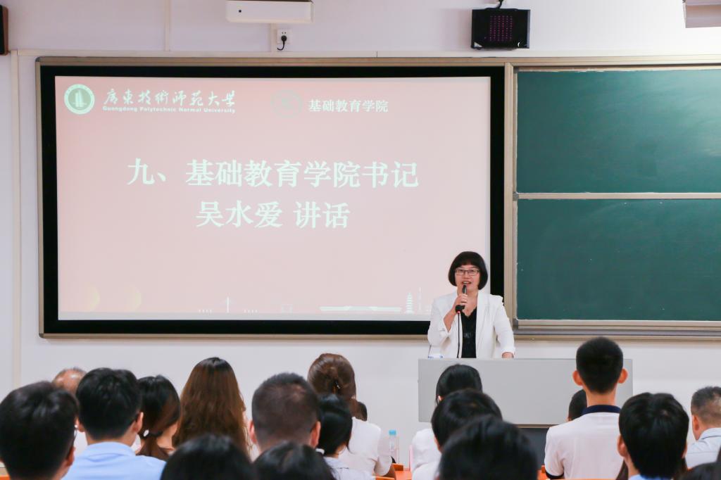 典礼尾声,吴水爱以《奋斗正当时青春献给党》为题发表总结讲话,寄语新生将个人理想融入教育强国使命。吴水爱回顾了中国人民抗日战争胜利80周年阅兵的震撼场景,强调传承抗战精神、厚植家国情怀的重要性;介绍了学校“厚德博学、唯实求新”的校训精神及“申博冲百”战略目标,勉励新生以广师大人的身份砥砺前行;并对新生提出了四点希望:一是胸怀远大理想,将个人追求与国家发展紧密相连;二是秉持刻苦钻研的精神,扎实掌握专业知识;三是锤炼品格修养,涵养高尚道德情操;四是学会团结协作,在互帮互助中成长进步。她表示学院将始终作为师生的坚强后盾,呼吁新生以青春之笔书写教育事业新篇章,为实现中华民族伟大复兴贡献青春力量。