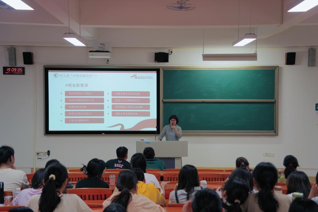 课上,吴水爱书记从“9个数字速读党的二十大报告,什么是中国式现代化,中国式现代化将如何开辟人类新路,新时代青年的使命担当”等方面,讲述了中国式现代化科学内涵、中国特色和本质要求,并结合习近平总书记视察广东对广东新的历史使命的重要论述和重要指示精神,广东省作出“1310”具体部署。引导学生作为新时代青年,生逢其时,施展才干的舞台无比广阔,实现梦想的前景无比光明,要在谱写中国式现代化进程中奋勇争先,在科技创新、乡村振兴、绿色发展、社会服务、卫国戍边等各领域各方面工作中争当排头兵和生力军,为中国式现代化注入青春力量。