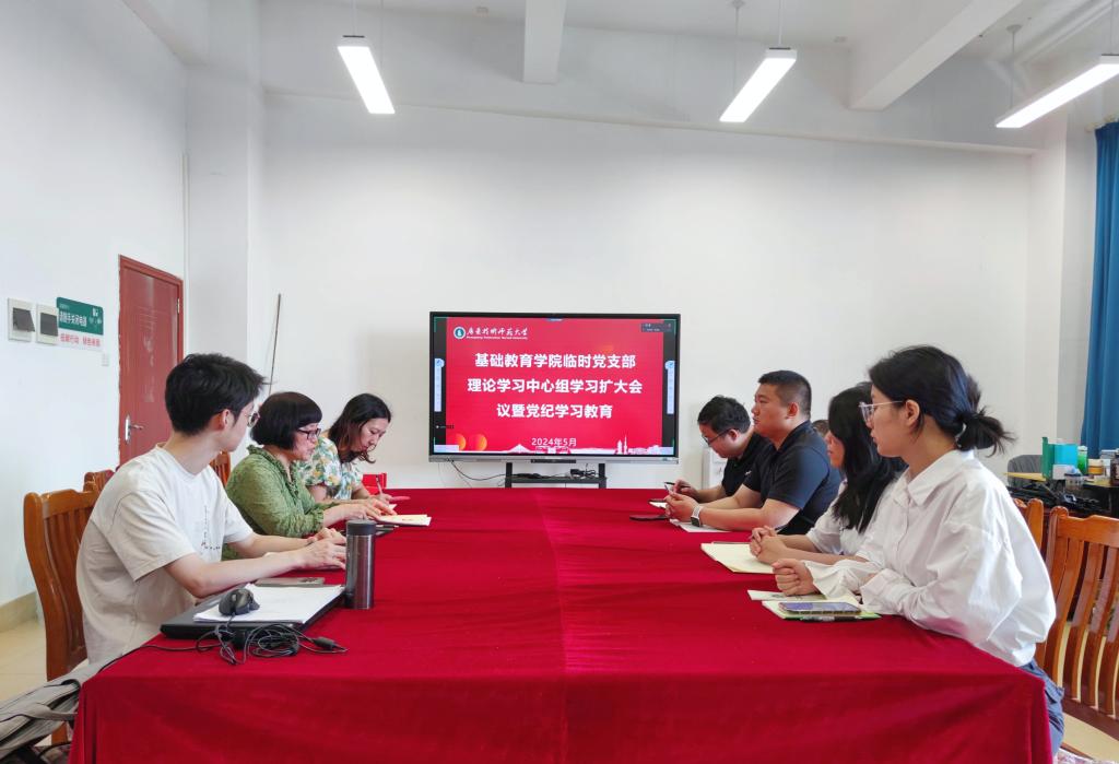 2024年是中华人民共和国成立75周年,是实现“十四五”规划目标任务的关键一年,推进理论武装、加强领导干 部理论学习至关重要。为深入学习贯彻习近平新时代中国特 色社会主义思想和党的二十大精神,根据关于《2024年中共TapTap点点官方网站委员会理论学习中心组学习计划》的通知要求,结合学院实际,TapTap点点官方网站临时党支部于5月15日开展理论学习中心组学习扩大会暨党纪学习教育。本次会议由学院吴水爱书记主持,学院专职辅导员、专任教师及入党积极分子参加。