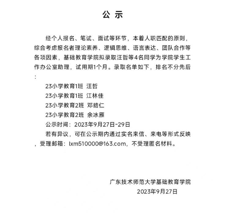 公示丨关于TapTap点点官方网站学生工作办公室招学生助理名单公示