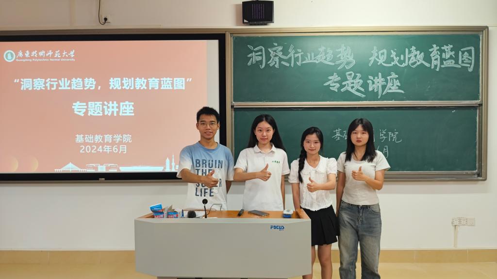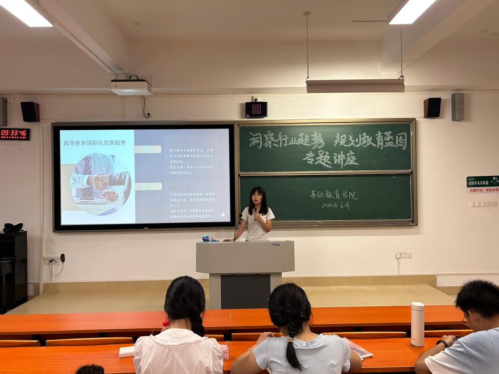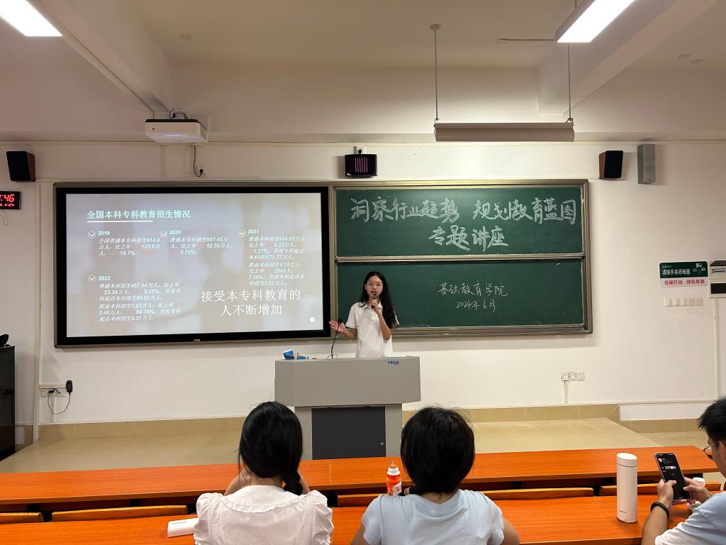 在全球化、信息化时代,教育会发生什么变化?适应迅速变化的时代,教育应该如何与时俱进,守正创新?讲座中,23小学教育2班余冰雁、23小学教育1班黄昊翔、23小学教育1班彭雯和23小学教育2班郑晓真4名同学分别围绕教育行业现状与宏观趋势、教育技术创新与驱动变革、教育行业细分领域发展、未来教育规划与展望等话题,结合自身的教育理论知识分享见解。“只有保持不断学习的状态,才有可能应对好纷繁复杂的新事物。”