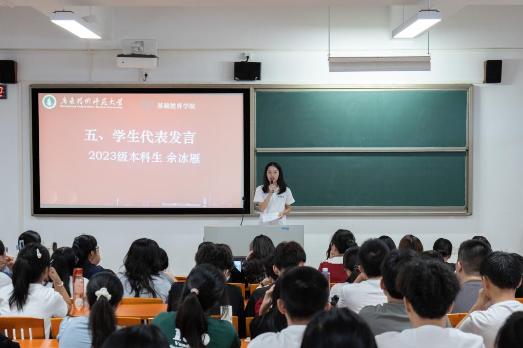 教师代表郭新斌老师则从自身教学经历出发,鼓励新生夯实专业基础,将教育理论与教育实践结合,心怀大我,至诚报国,为实现教育强国目标,助力中华民族伟大复兴的中国梦,贡献力量。