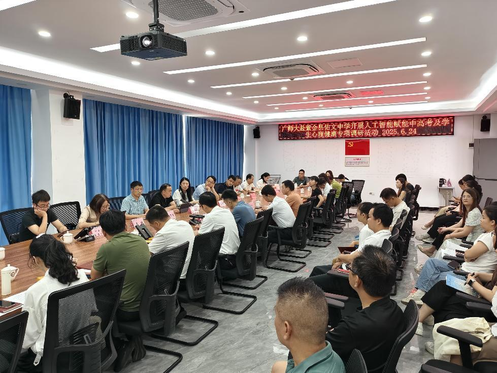 调研组熊华军院长、朱姝副教授、张晓梅副教授等分别针对佑文中学人工智能和心理健康教育等相关内容发表意见和建议,与市教研院、佑文中学心理教师针对在校学生心理状况评估、课堂引导学生自我调适、人工智能赋能教师减压等议题展开深度讨论,深入了解当地心理教师教学痛点并提出相关解决方案。在会谈中,紫金佑文中学校长表示要深入落实佑文中学心理健康教育相关工作,努力打造佑文中学的心理健康特色学科。紫金县教师发展中心赖主任提出要打造紫金县教师发展中心,提出试点先行逐步推进的举措;教育局邓洪练书记就针对推进人工智能融入课堂、提升心理健康水平等试点方案逐步完成、稳步推进提出重要意见和建议。最后,河源市教育局黄汝荐副局长就当地师资培训、课堂步骤操作、心理资源整合融入、教学平台依托等议题提出意见,就当地相关教育工作做出指示,并为此次会谈作总结。